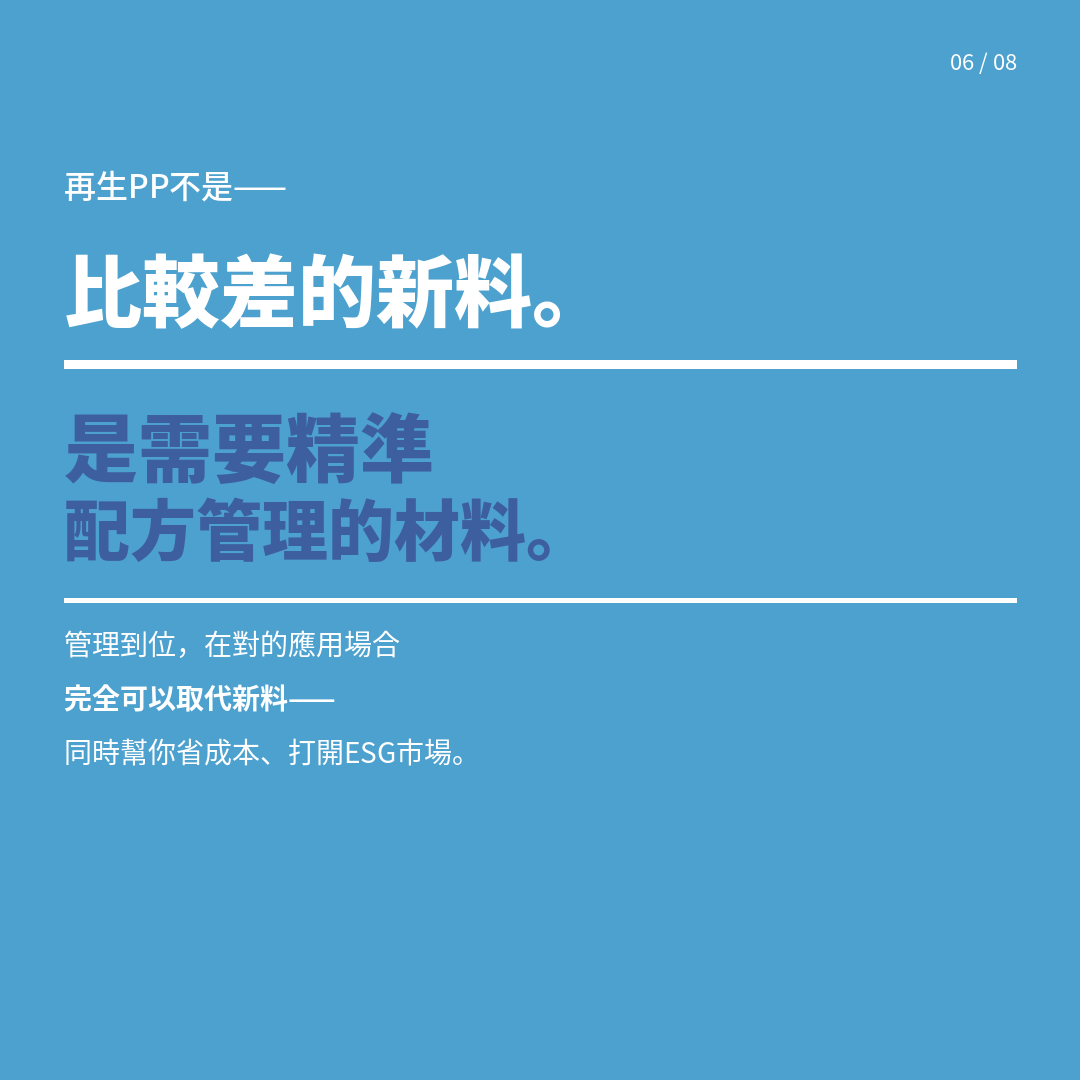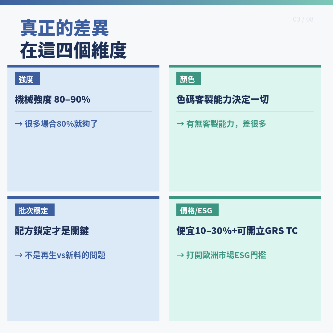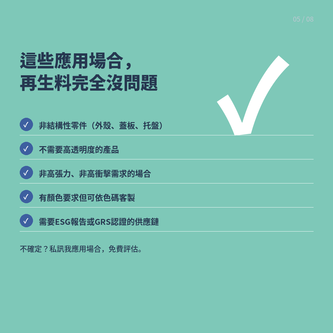 再生塑膠(PP、ABS、PA、PS、PE)也是一樣。差不差,看的是管理,不只是「新不新」。