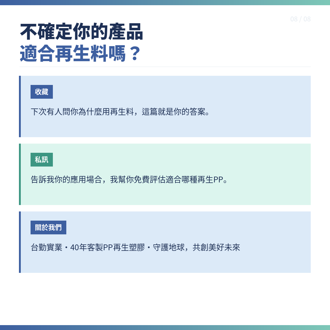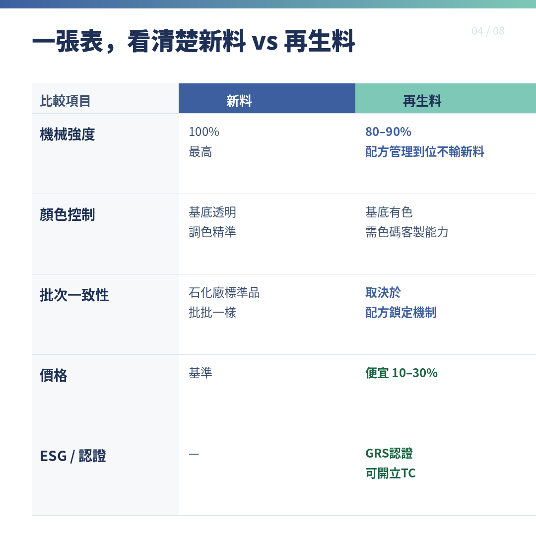 → 這個才是選廠商的關鍵,不是「再生vs新料」的問題