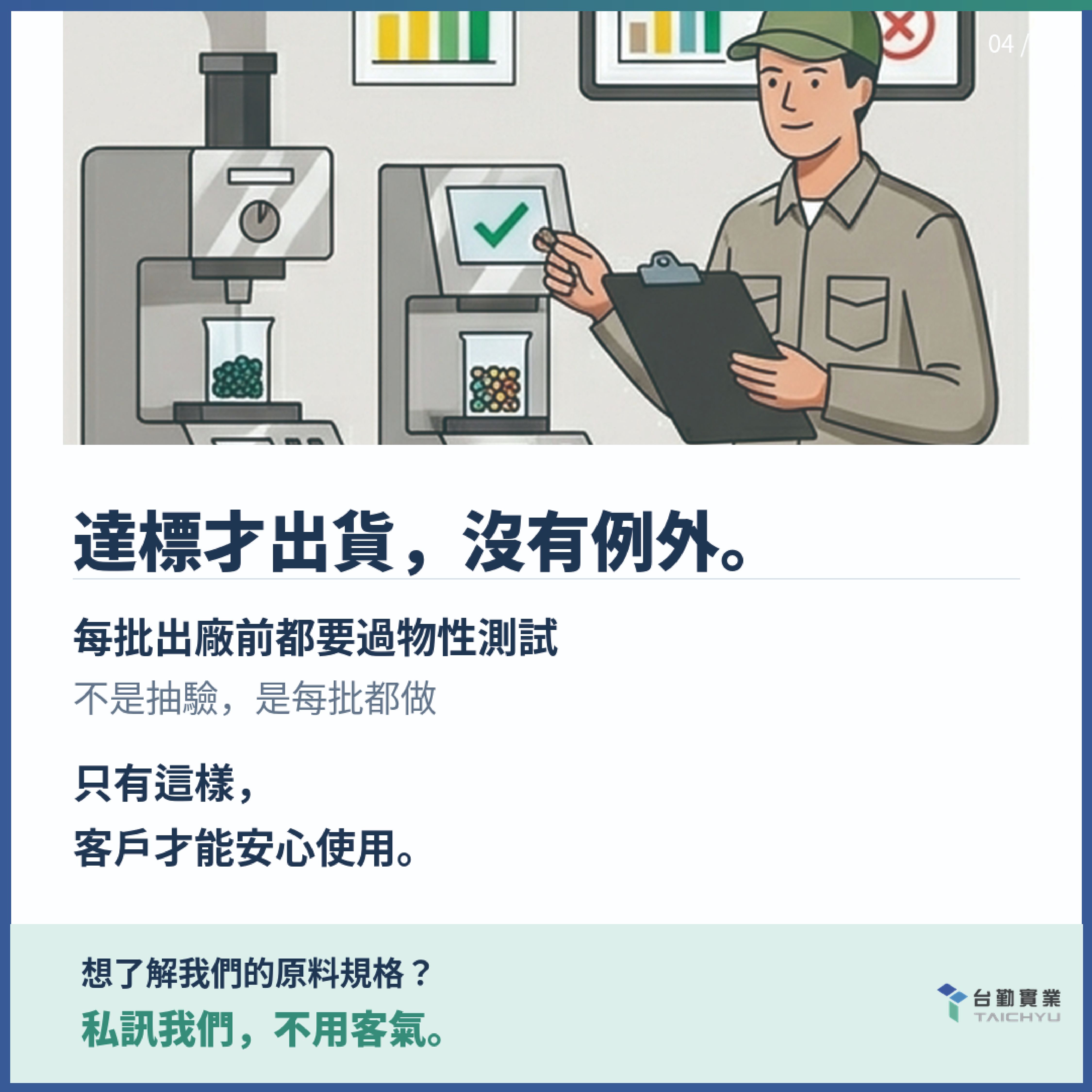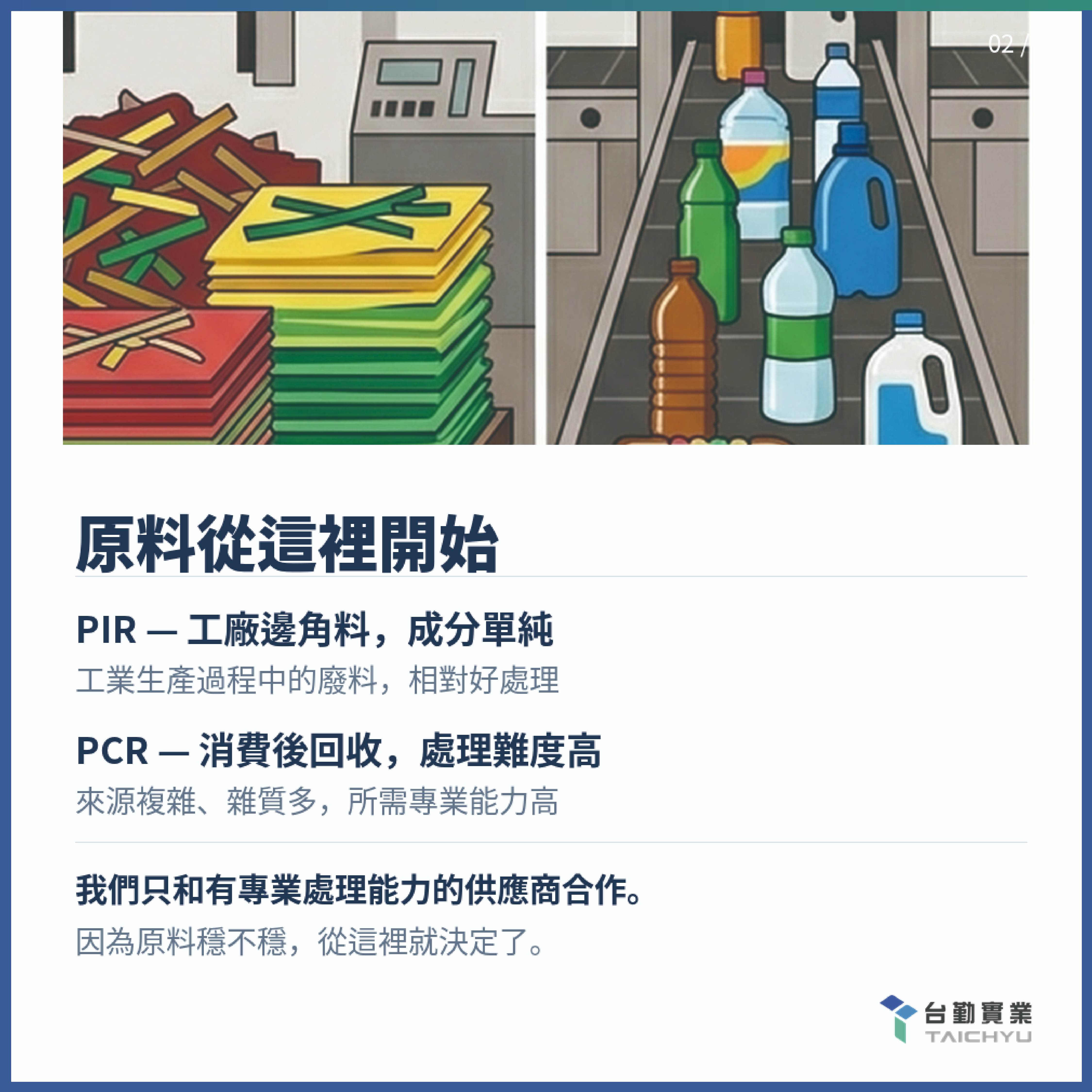 我們收PIR(使用前)和PCR(使用後)兩種回收來源,只和有專業處理能力的供應商合作。每個客戶的配方獨立建檔,每批原料出廠前都做物性測試—不是抽驗,是每批都做。 因為我們知道,只有這樣,客戶才能安心使用。