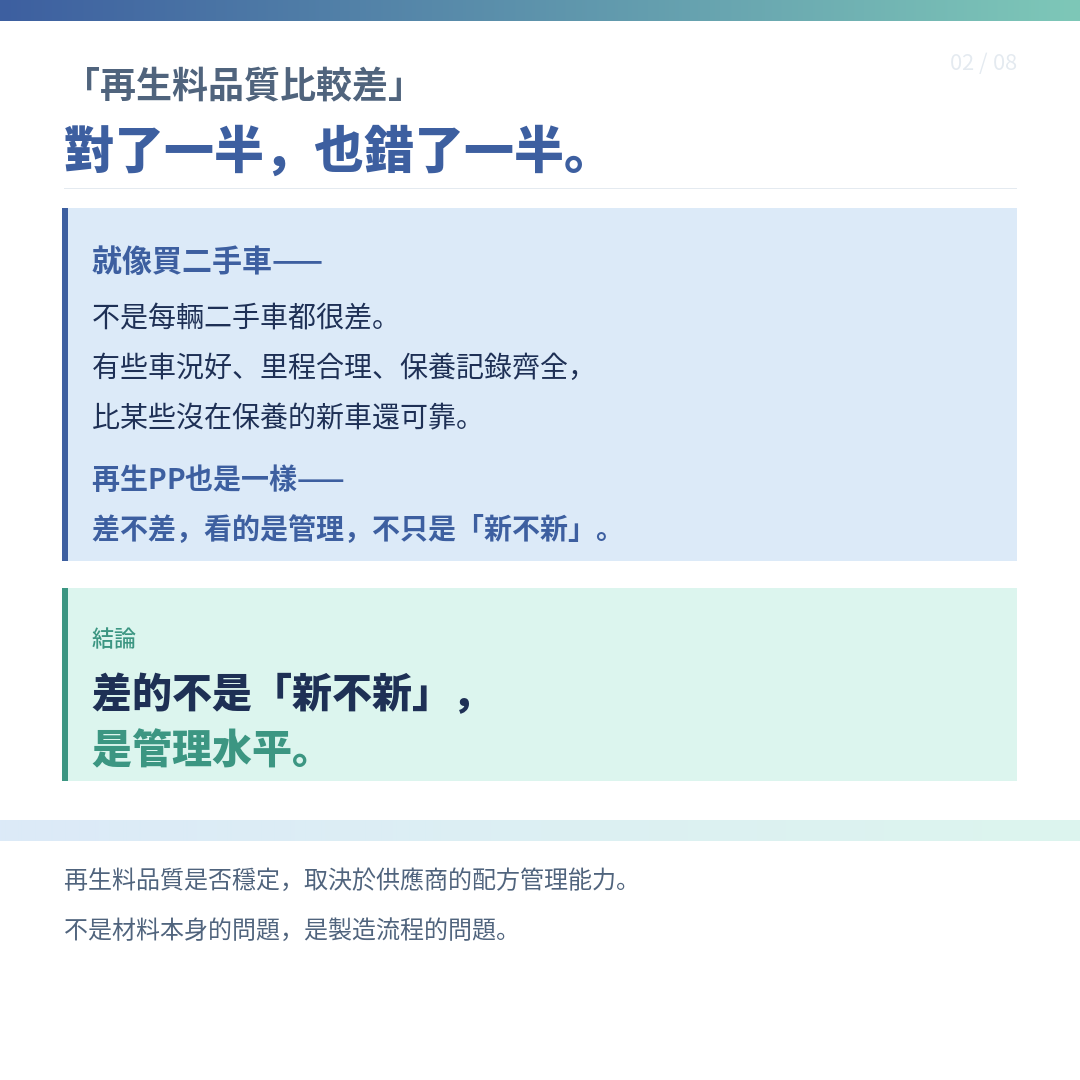 再生塑膠(PP、ABS、PA、PS、PE)也是一樣。差不差,看的是管理,不只是「新不新」。