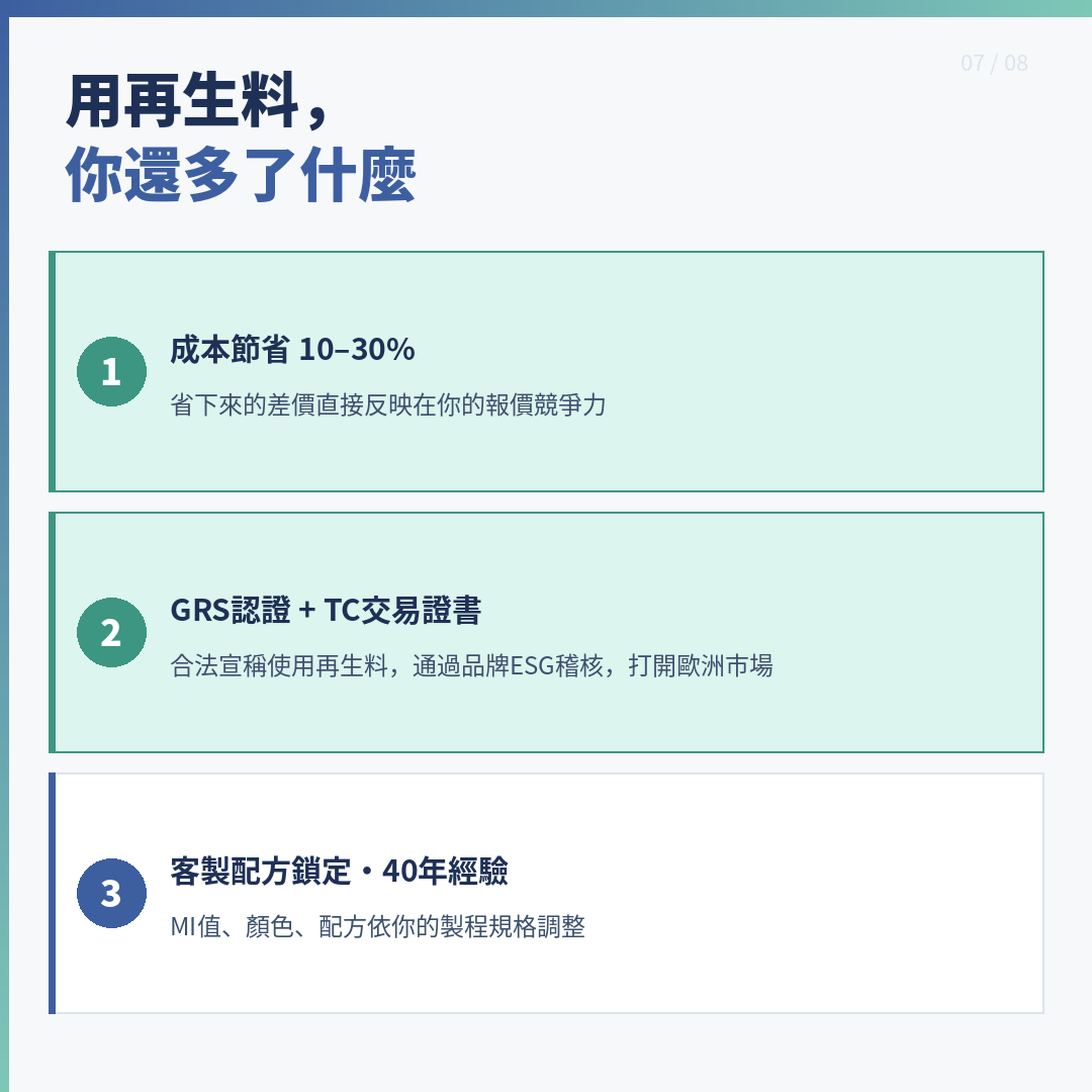 → 這個才是選廠商的關鍵,不是「再生vs新料」的問題